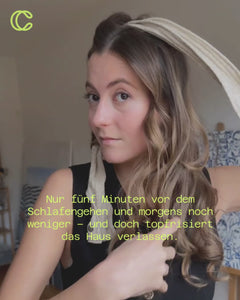 Lieber nicht. Deine Haare sollten komplett trocken sein, bevor du CURLS-IN einwickelst. Wenn du das Lockenband in nasses Haar drehst, trocknen die Strähnen nicht richtig – und die Locken werden weniger definiert und haltbar. Für das beste Ergebnis: erst vollständig trocknen, dann CURLS-IN verwenden.